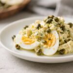 Capers bring a salty, lemony snap that balances the richness of the eggs and mayo. A touch of acid—lemon juice or vinegar—wakes everything up, while fresh herbs keep it bright. The texture is creamy but not mushy, with small, tender chunks of egg and little pops of caper in every bite.