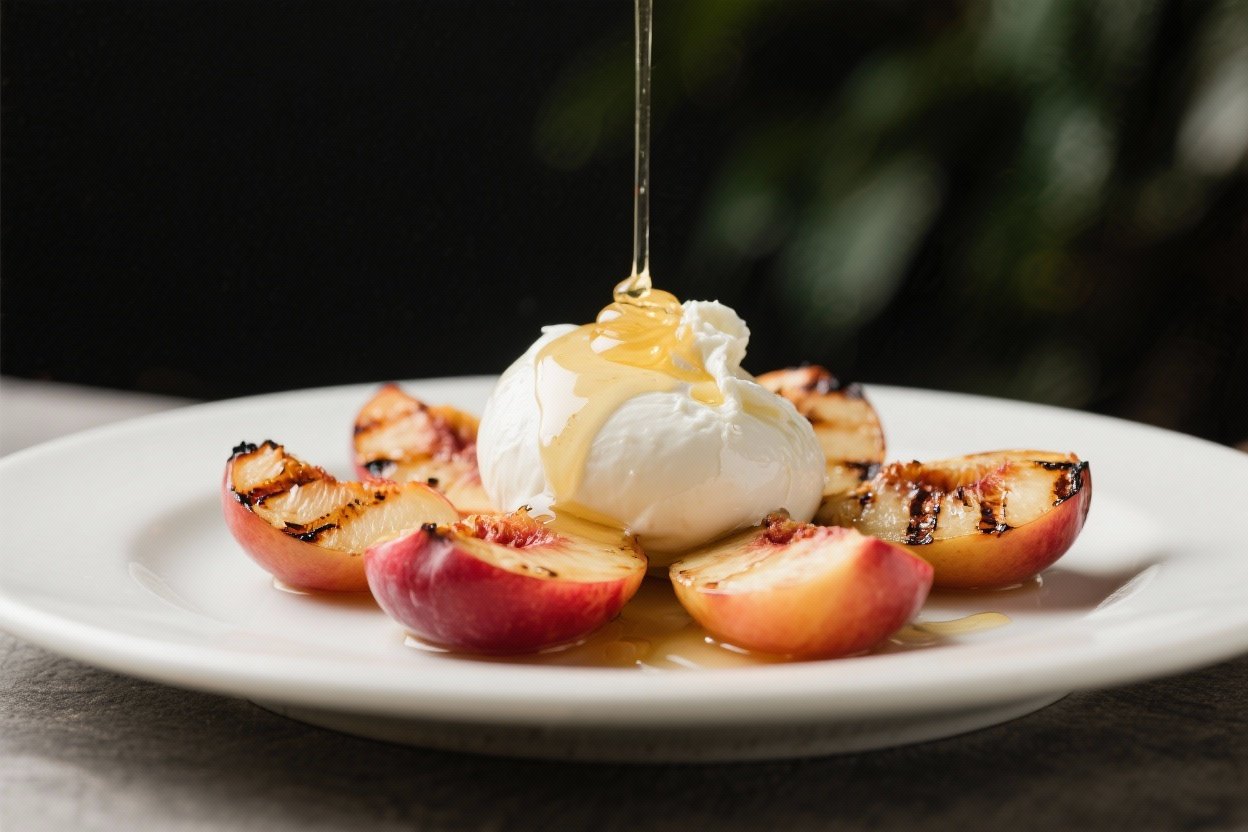 Burrata brings lush, cool creaminess that balances the warm fruit and makes each bite feel luxurious. A drizzle of honey lifts the flavors and lends a glossy finish. A splash of lemon or balsamic adds brightness, and a pinch of flaky salt sharpens everything.