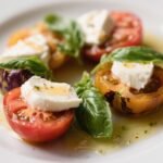 - Arrange the plate: On a large platter, alternate layers of tomato slices, torn mozzarella, and whole basil leaves. Don’t pack it too tight—leave space so everything breathes.