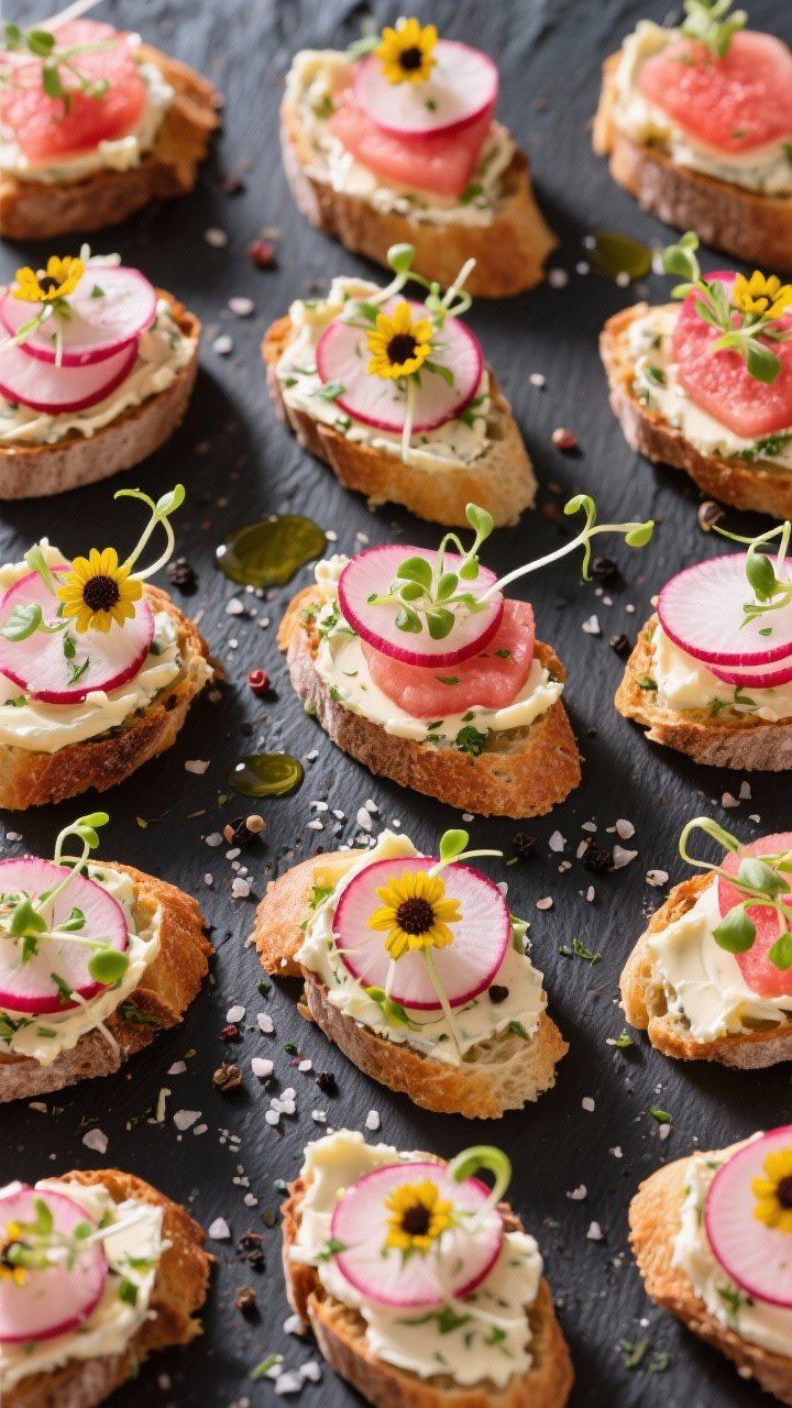 - Assemble: Spread a generous layer of herb butter on each crostino. Shingle a few radish slices on top. Add a small tuft of sunflower sprouts.